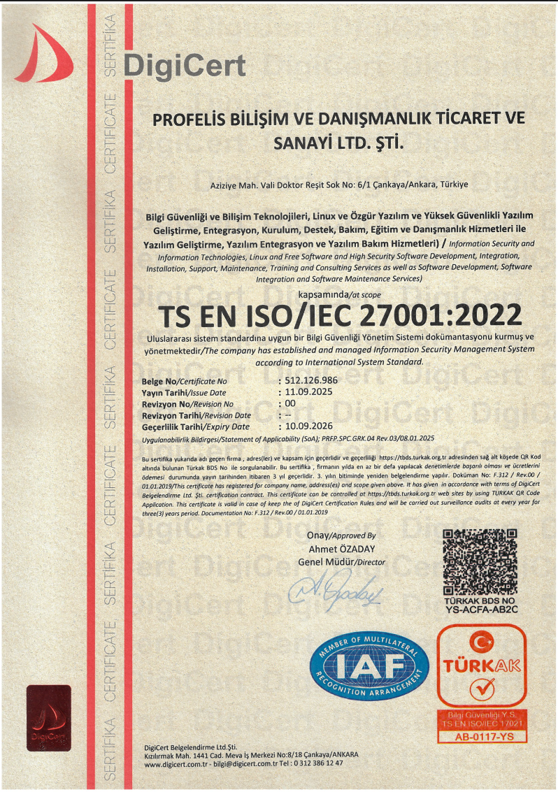 Profelis ISO 27001:2022 belgesi ile, BİLGİ GÜVENLİĞİ VE BİLİŞİM TEKNOLOJİLERİ, LİNUX, ÖZGÜR YAZILIM VE YÜKSEK GÜVENLİKLİ YAZILIM GELİŞTİRME, ENTEGRASYON, KURULUM, DESTEK,BAKIM, EĞİTİM VE DANIŞMANLIK HİZMETLERİ İLE YAZILIM GELİŞTİRME, YAZILIM ENTEGRASYON VE YAZILIM BAKIM HİZMETLERİ alanındaki çalışma kalitesini tasdik etmiştir.