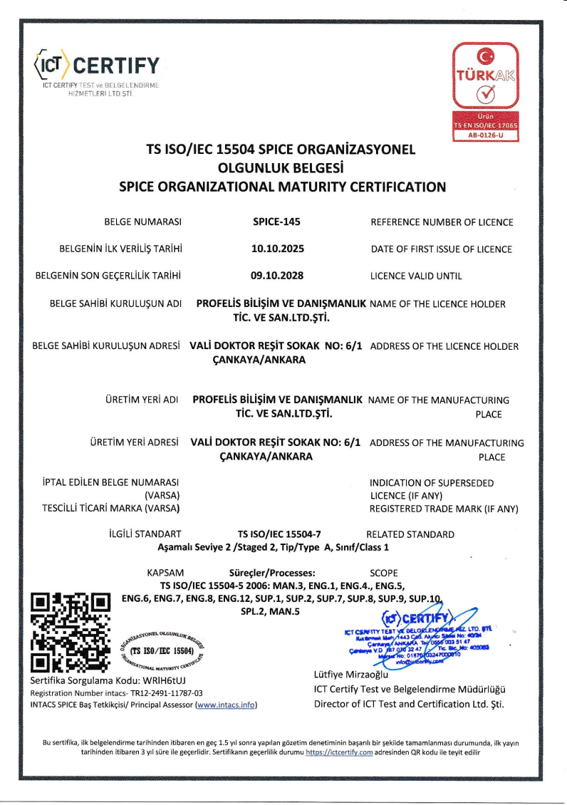 Profelis, ICT Certify Test ve Belgelendirme Hizmetleri LYD. ŞTİ. tarafından verilen TS ISO IEC 15504 SPICE Organizasyonel Olgunluk Belgesi‘ne sahiptir.